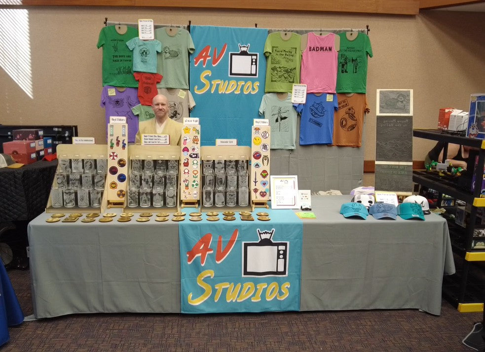 Here are some samples of the items we sell at our artist alley tables. All of our products' themes revolve around the great time period when you were plugging AV cables into the tv for entertainment.